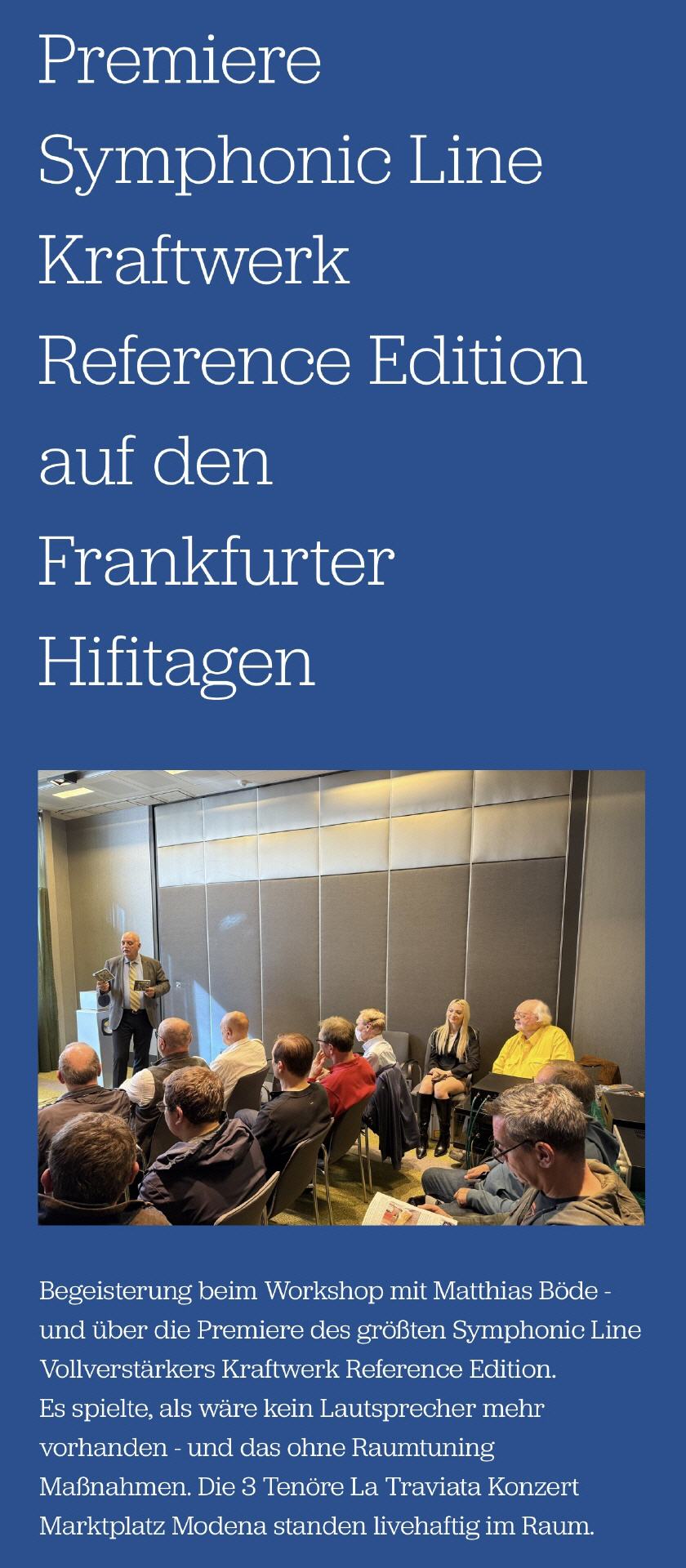 Hamburg - begeisterte Hörer standen bis in den Flur. Lite Magazin schreibt: … atemberaubend dynamisch…eine Räumlichkeit die die Lautsprecher akustisch verschwinden ließ …Hier wurde die Musik tatsächlich zu einem Erlebnis!